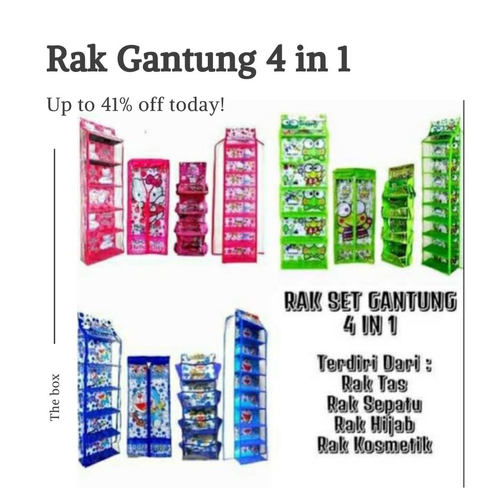 Deskripsi : •Bahan Mika Tebal Istimewa, Full Resleting. •Sekat Karton Tabal, Kuat. •Motif Karakter • Uk rak gantung sepatu 112 x 30 x 16 Cm • Uk rak gantung tas 135 x 40 x 13 Cm• Rak Gantung Karakter Set 4 in 1 1 Jenis Rak Sepatu 9 Susun Full Resleting 1 Jenis Rak Tas 6 Susun Full Resleting 1 Jenis Rak Kosmetik 4 Susun 1 Jenis Gantungan Jilbab 4 Susun Full ResletingWelcome. Happy Shoping⏰ Toko Buka Hari senin s/d Minggu pukul 09.00 WIB 21.00 WIB⏰ Untuk Pesanan Hari Minggu akan Dikirimkan Di Hari Senin⏰ Semua Pesanan Di hari yang Sama akan Dikirim jam 17.00 WIB⏰ Untuk Pesanan yang Lewat dari Jam Tersebut akan Dikirimkan Esok Hari nya. Barang yang tersedia semua ready stock. Warna dapat dipililh di variasia dan produk yang akan dikirimkan sesuai variasi warna yang dipilih.( jika kosong akan di konfirmasi oleh admin, jika tidak merespon akan kita kirim RANDOM ) Mohon untuk isi data diri dengan lengkap (untuk memudahkan kurir menemukan alamat tujuan) Apabila terjadi kesalahan atau cacat produk mohon terlebih dahulu membuat video awal pembukaan paket (Unboxing) Saat Paket telah diterima, karena kita tidak menerima complain jika ada barang yang rusak atau salah kirim tanpa adanya video unboxing dan tidak terdapat gar