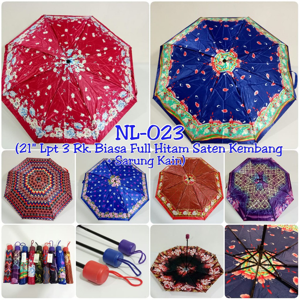Name: (1kg 5pcs) Payung Lipat 3 Nagoya Rangka Hitam Bahan Saten Motif Bunga Jepang + Sarung