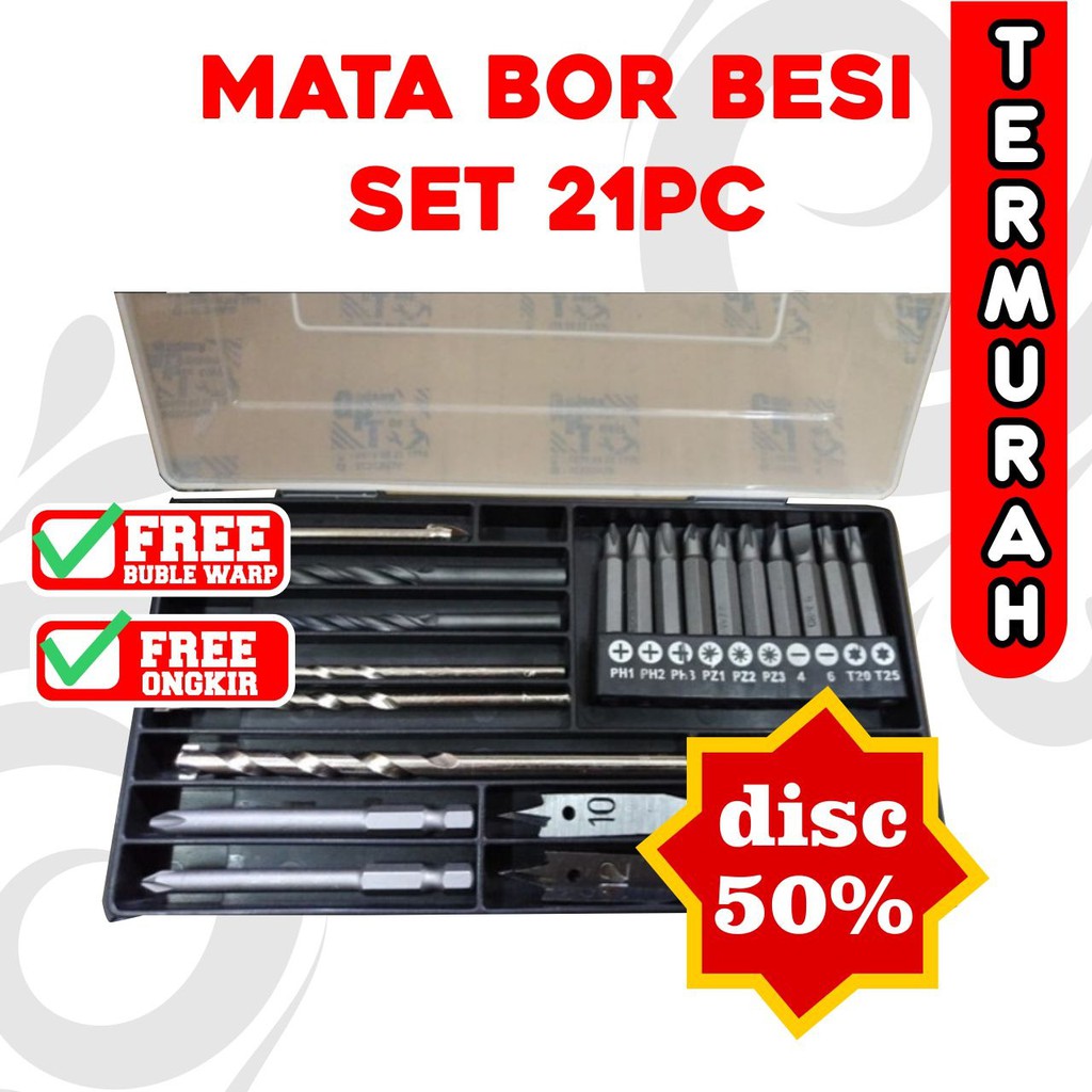 isi 21pc sesuai foto10pc mata obeng panjang 65mmmata kayu: 10mm 12mmmata bor beton: 5,6,8mmmata bor besi: 5,6mmmata keramik 6mmmata obeng xtra panjang : CR-V