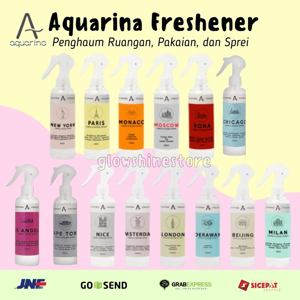 Aquarina Pengharum Ruangan Spreai Air Freshener.Aquarina Freshener adalah pewangi multifungsi. Bukan hanya bisa membuat wangi ruangan, tapi bisa digunakan juga untuk pakaian, sprei, atau hal lain yang berbahan kain.Aquarina memberikan pilihan wangi yang berbeda dengan yang ada di pasaran saat ini. Kalau biasanya pilihan wangi yang ada adalah jenis - jenis bunga, namun Aquarina Freshener punya wangi yang beda.Aquarina Freshener akan mengeluarkan scent - scent kgas dari merk parfum yang best seller atau terkenal di dunia.Cuma perlu semprotkan Aquarina Freshener saat menyetrika, atau kapanpun saat kamu ingin ruangan kamu wangi. Dan Aquarina Freshener aman untuk bayi. Dan Aquarina Freshener aman untuk bayi. Untuk pakaian bayi, JANGAN langsung disemprotkan ke bayi. Beri jeda sekitar 10-15 menit, baru pakaian atau sprei dapat digunakan oleh bayi anda.Aquarina Freshener saat ini ada 17 varian :- London (Jo Malone English Pear)- Amsterdam (Marc Jacob Daisy)- New York (Lovely SJP)- Beijing (Jo Malone Peony Blush)- Nice (Chanel Allure Pour Homme)- Derawan (EDT Garuda Indonesia Airlines)- Roma (Givency Amirage)- Moscow (Hugo Boss Iced)- Monaco (Hermes Twilly)- Milan (Salvatore Ferragamo Incanto Shine)- Paris (Louis Vuitton Mile Feux)- Chicago ( D & G Light Blue)- Cape Town (Jaguar Vision)- Los Angeles (Paris Hilton)- Miami - California (Chloe)- Zurich (Jadore Christian Dior)KEGUNAAN SERBAGUNA AQUARINA AIR FRESHNER :1. Pengharum Ruangan (Kamar,Toilet.Ruang Tamu,dll)2. Linen Spray (Gordyn, Sprei,Bantal,Sofa,Karpet,dll)3. Pengharum Pakaian (Dapat digunakan langsung atau saat menyetrika)4. Pengharum Alat Shalat (Sajadah,Mukenah,Sarung,dll)5. Pengharum MobilUKURAN BOTOL 2