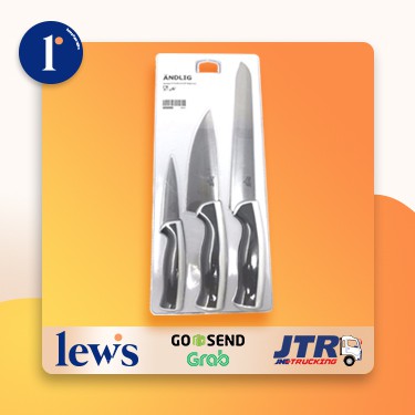 Pisau, set isi 3 : Pisau Roti, Pisau Koki & Pisau Iris- Desain dan bahan gagang memberi pegangan yang kuat.perancang:D Crafoord/U Vejbrinkbaik untuk mengetahuiTerdiri dari: pisau roti 23 cm (tot. panjang 35 cm), pisau koki 15 cm (tot. panjang 28 cm) dan pisau iris 10 cm (tot. panjang 20 cm).cara perawatanHanya untuk dicuci dengan tangan.Dekripsi produk & ukuranGagang: Plastik polipropilena, Karet sintetisMata pisau: Baja tahan