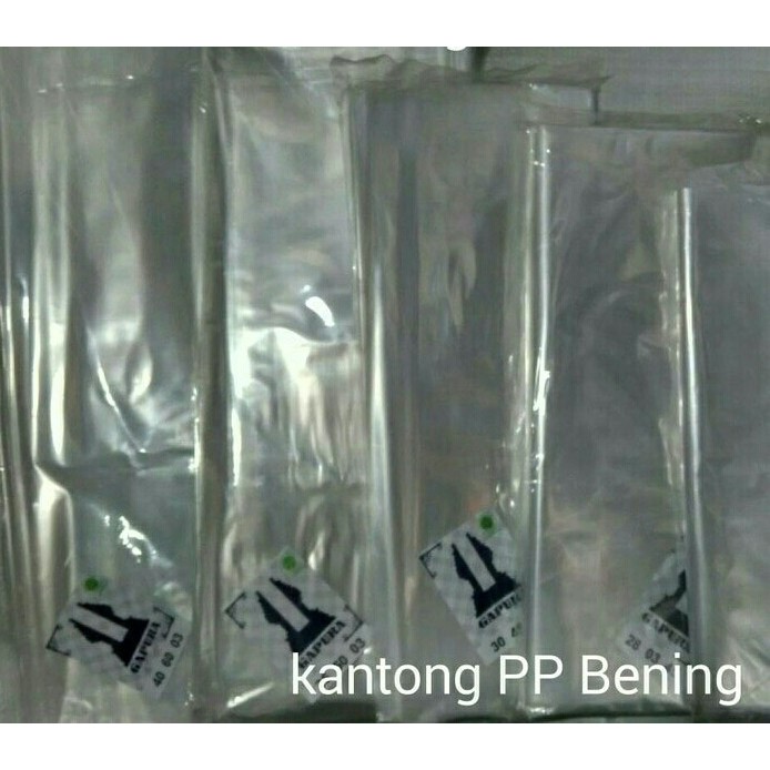 pp bening ALL SIZEtebal 0,3 mmada 9 ukuran tersedia yaitu- 20x35- 23x40- 25x40- 30x45- 35x50- 40x60- 45x65- 50x75- 60x100plastik nya bening transparan, bentuk nya kaya karung. tanpa ada jinjingan nya.bisa digunakan untuk loundry, bungkus pakaian, dan bisa digunakan buat bungkus makanan ringan,seperti kerupuk ,kue, dan snack-s