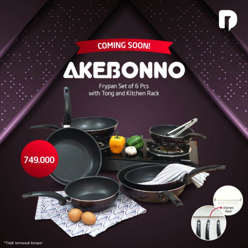 1. Akebonno Frypan Set of 6 Pcs with Tong and Kitchen Rack*Solusi Memasak Jadi Lebih Mudah dengan Akebonno Frypan Set!Masak di rumah anti ribet check ! Semua akan teratasi jika kamu menggunakan Akebonno Frypan Set of 6 Pcs with Tong and Kitchen Rack. Dengan material 100% alumunium anti lengket, akan mempermudah kamu dalam memasak, dan dapat digunakan untuk menggoreng, menumis, ataupun memasak masakan kuah sekalipun lho!*Keunggulan Produk:*1. Material aluminium dilapisi dengan PTFE di bagian bottom dan top.2. 100% food grade, aman untuk semua bahan makanan.3. Multifungsi , dapat digunakan untuk memasak , menumis dan menggoreng.4. Ketebalan lapisan PTFE 20-25 micron.5. Ketebalan Pan 2.00mm.6. Ketinggian Pan 6.5 – 7.5cm.7. Handle bakelite yang nyaman.8. Anti lengket dan tahan gores.9. Bagian bawah pan didesain dengan bentuk lingkaran supaya tidak licin pada saat memasak10. Gunakan deterjen dengan bahan ringan untuk membersihkan wadah pan.11. Penggunaan hanya bisa pada kompor gas dan listrik.*1 Set Terdiri dari:*1 Pc Frypan uk. 20 cm,1 Pc Frypan uk. 22 cm,1 Pc Frypan uk. 24 cm,1 Pc Frypan uk. 26 cm,1 Pc Frypan uk. 28 cm,1 Pc Frypan uk. 30 cm,1 Pc Tong (Capitan)1 Pc Kitchen Rack (Gantungan)*PACKAGING*Ukuran Produk: 525 x 340 x 230 mmBerat/Set: 4
