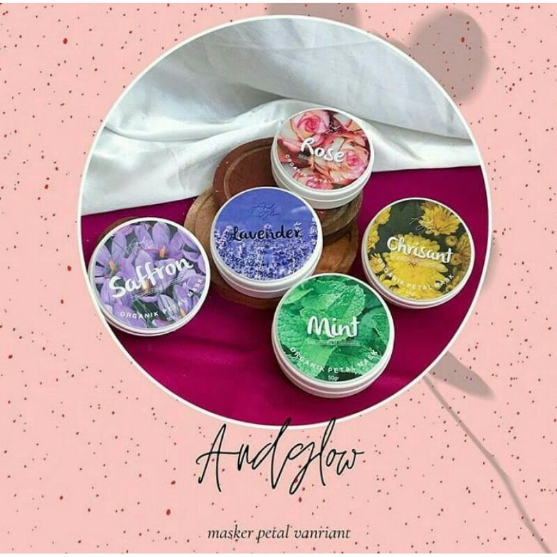 Manfaat : Varian saffron :-mencerahkan kulit kusam-menghilangkan komedo-mengecilkan pori-pori-memudarkan bekas jerawat Varian chrisant : -menghaluskan kulit wajah-menghidrasi dan melembabkan kulit wajah-mengoksidasi dan mendetoks kulit wajah Varian Lavender :-mengatasi jerawat -mencegah tumbuhnya jerawat -memperbarui sel kulit mati☘️ Varian Mint :- 3kali mencerahkan kulit wajah (langsung terlihat setelah pemakaian)-mengatasi kulit kusam -dengan sensasi dingin ketika pemakaian Varian rose :-anti aging (mengurangi garis halus atau kerutan)-mengurangi flek hitam-menghaluskan kulit wajah-mengurangi iritasi kemerahan pada wajahMASKER ANDGLOWmasker organik berbahan dasar alami dengan helai mahkota bunga asli yang mempunyai berbagai macam manfaatKomposisi : beras organik,olive,oil,madu, ekstrak buah dan mahkota bunga.Netto : 50gramExp : 6bulan setelah dibukaBentuk masker bubukAman untuk bumil dan busui bisa dipakai usia 13tahun k